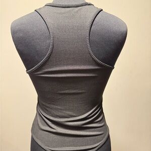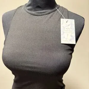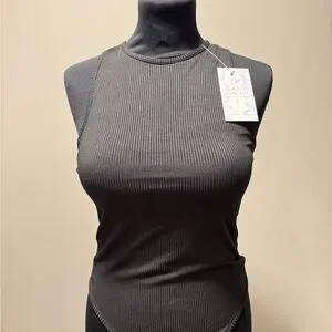 Elevate your wardrobe with this sleek black ribbed sleeveless top. Body suit with thong bottom. Perfect for any occasion, it offers both style and comfort. Brand new with tags. Built in bra with removable pads.