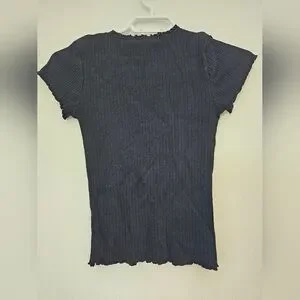 This stretchy stylish black ribbed t-shirt is perfect for any occasion. Its sleek design offers a comfortable fit, making it a versatile addition to your wardrobe.