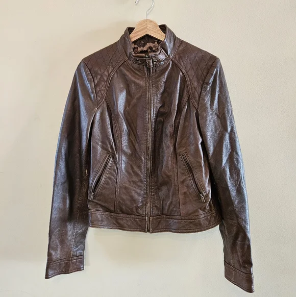 Stylish brown leather jacket with quilted shoulders and buckle collar. Genuine real leather with fun cheetah print interior.