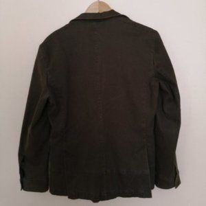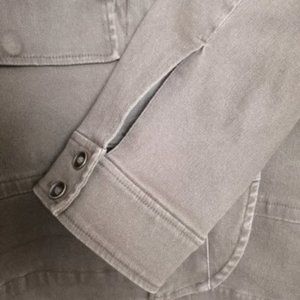 Black Rivet utility jacket suitable for men or women. The color is green and brown mixed together. There are 8 pockets! Some interior pockets and some exterior pockets. There are 3 stitched arrows on the left sleeve.