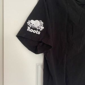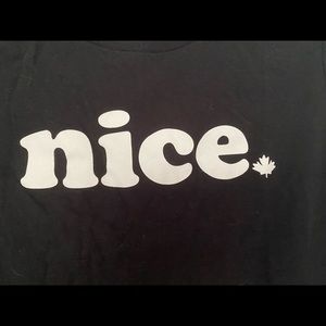 Black t-shirt with the word “nice” embroidered on the front. The Roots logo is printed on the right sleeve. Size medium. Never been worn.