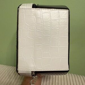 Stylish black round handbag with a sleek handle.
