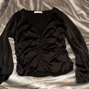 Elegant black blouse with ruched front. Long sleeves and V-neckline. Ideal for any occasion.