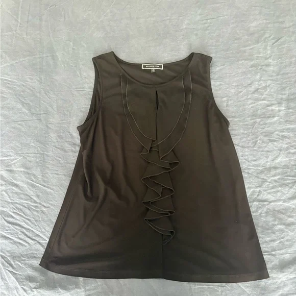Black sleeveless tank with a feminine ruffle detail down the center front. Lightweight, smooth fabric for comfortable everyday wear. Easy to dress up or wear casually. Versatile black color pairs well with skirts or pants.