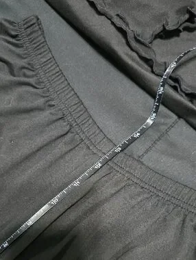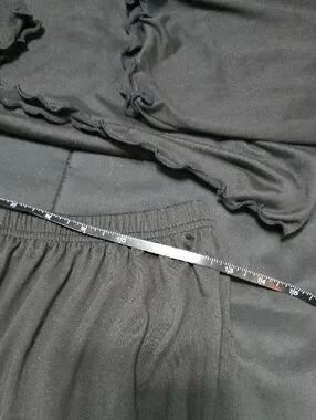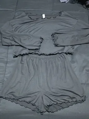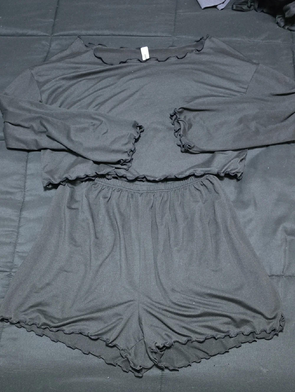 Soft black two-piece lounge set with ruffle trim. Comfortable elastic waist shorts and long-sleeve crop top for relaxed wear. Lightweight fabric designed for everyday comfort and easy care. Classic black color pairs well with any sleepwear collection.