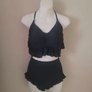 Stylish black bikini set with ruffled details. High waited bottom. Tummy control
