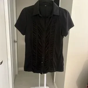 Classic black women’s top with a ruffled front placket. Lightweight fabric offers comfortable all-day wear. Button-front styling for easy dressing. Elegant silhouette suitable for work or casual outings.
