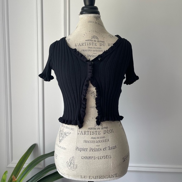 Elevate your style with this chic black ruffled button-up top. Perfect for any occasion, this top offers a flattering fit and elegant design.