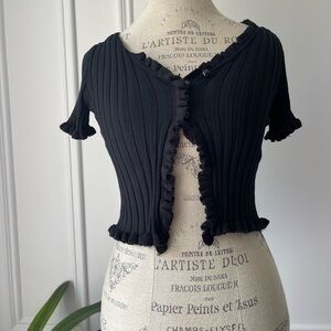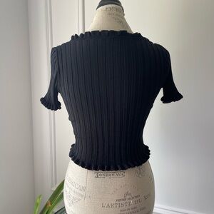 Elevate your style with this chic black ruffled button-up top. Perfect for any occasion, this top offers a flattering fit and elegant design.