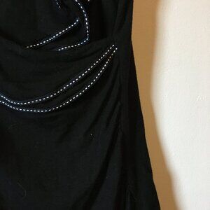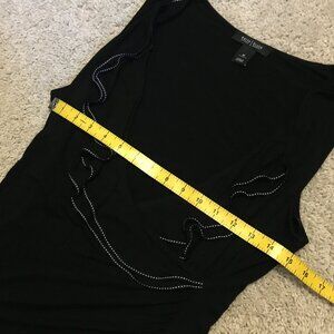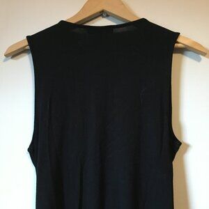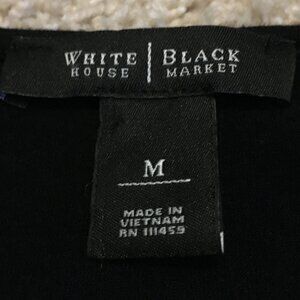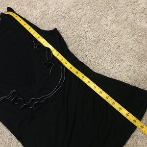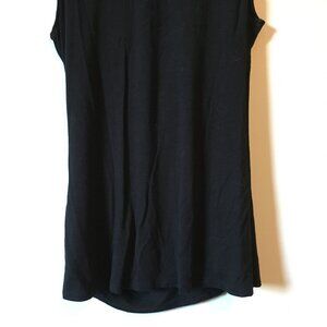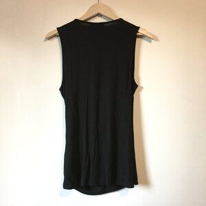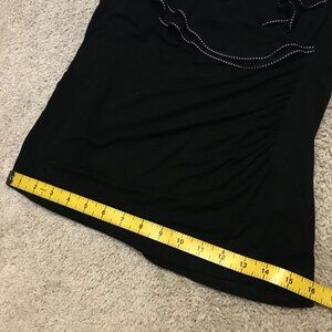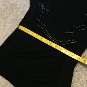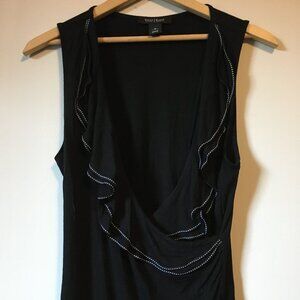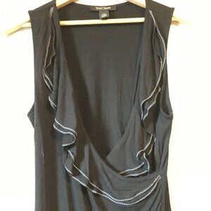 Very good preowned condition, black, sleeveless, stretchy rayon wrap tank top, with plunging neckline and ruffles trimmed in white stitchwork all along the collar by White House Black Market. There is gathering on the left side for a flattering fit.