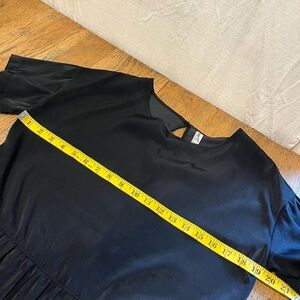 Chic black short-sleeve blouse with a gathered ruffled hem. Features a round neckline and keyhole button closure at the back. Lightweight polyester fabric semi-satin finish. Versatile and easy to dress up or down.