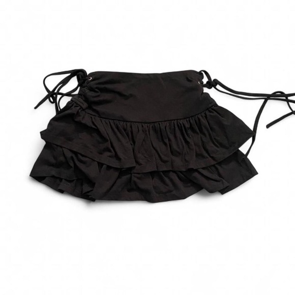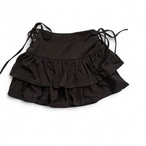 Chic black mini skirt with ruffled layers and tie details. Perfect for a stylish look.