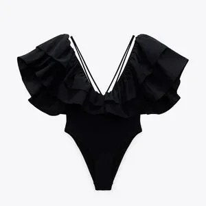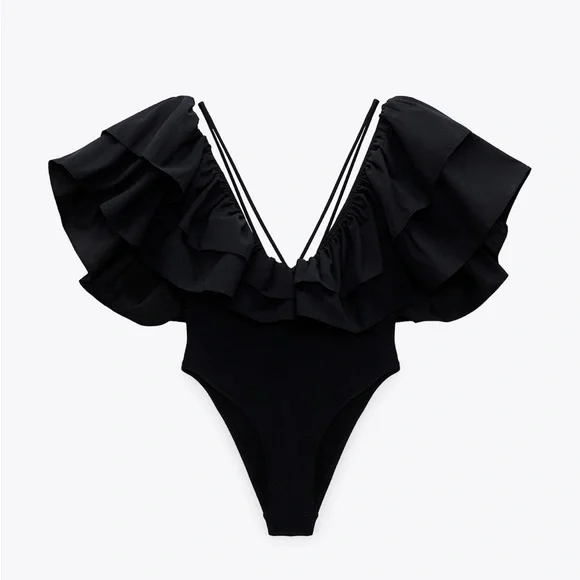 Elegant black one-piece swimsuit with ruffled sleeves. Perfect for a stylish beach day.