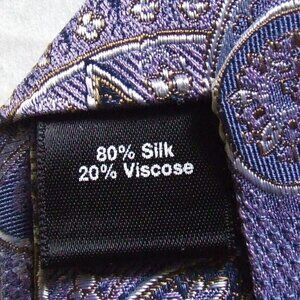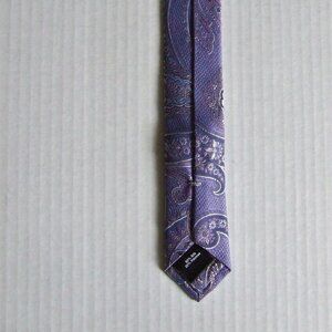 Black Saks Fifth Avenue necktie. Purple and silver white paisley print. 80% silk and 20% viscose. It is 3.25 inches at its widest point. There are not any stains, tears, or holes. Very good, gently used condition.