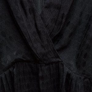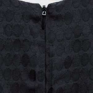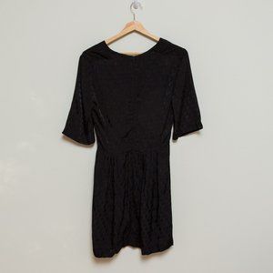 Chic black dress by Sandro Paris, size 1. Short skirt (above the knee), pockets(!!!), cross-over front, mid-length sleeves. If you are smaller chested (like me) you will probably want to pin (or stitch) the front as the opening is quite big. The fit is flattering but it can be a bit restricted through the shoulders. If you aren't looking to put your arms over your head too much it should be okay. Great long zipper at the back, easy to get in and out of. Pretty oval pattern woven into the fabric. Unlined. European sized, size 1 (small).