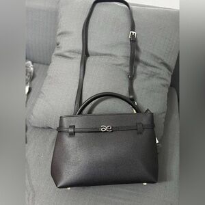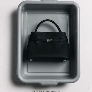This black satchel features a sophisticated and structured silhouette, perfect for everyday use. Its smooth matte finish and top handle design add a touch of elegance to any outfit. The bag's clean lines and subtle embellishment detail make it a versatile accessory for any occasion.