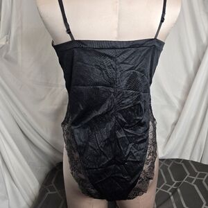 Elegant black satin lace bodysuit. Features intricate lace detailing. Perfect for a night out.