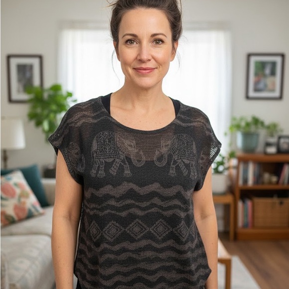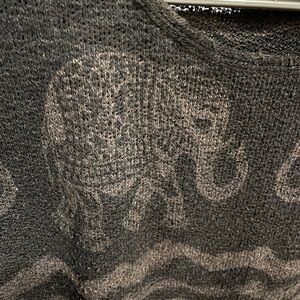 Stylish black sheer top with elephant pattern. Perfect for casual wear.
