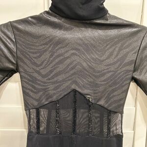 Stylish black dance bodysuit / costume with sheer paneling and zebra pattern. Perfect for Acro, open or contemporary solo.