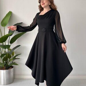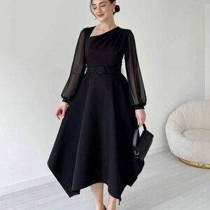 Black Sheer Sleeves Asymmetrical Cut Collar Stoned Midi Dress - S, M