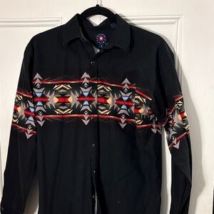 Stylish black shirt featuring a vibrant geometric pattern in red, blue, and yellow.