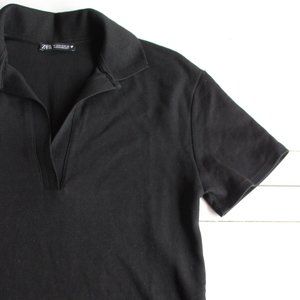 From Zara, a black polo shirt dress. A shift silhouette. Perfect for a casual preppy outfit with white socks and loafers. You can use it as a beach coverup OR pair with sneakers and crewneck sweatshirt for a sporty look.