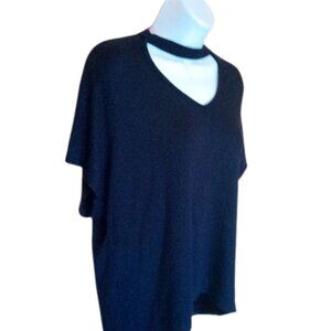 Loose black top a v neckling and a strip of fabric at the neck that looks like a choker