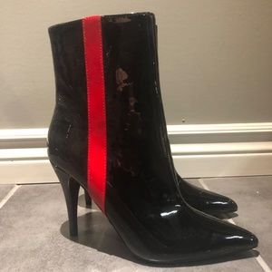 Black skinny heel boot with red stripe. New with tags! Never worn! Bought for a costume and did not end up using them. From Forever 21.