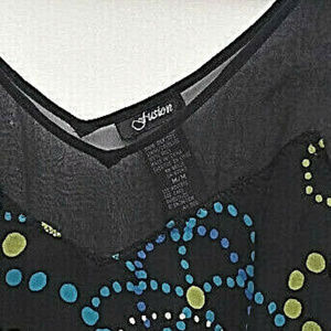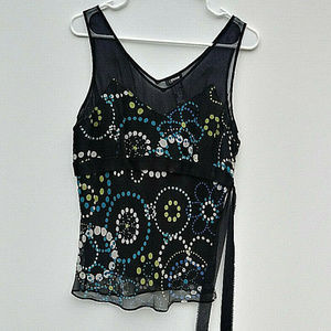 Beautiful Black, sleeveless top with geometric pattern in blue, white and green. 100% silk and lining 100% poly. Women's size medium. Great condition. No stains, rips, or tears.