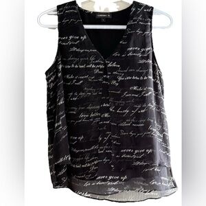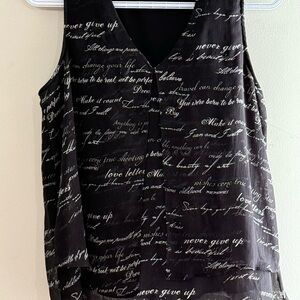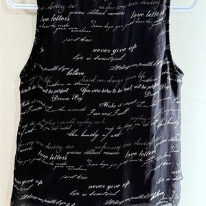This black tank top showcases a bold graphic design with white handwritten text, offering a striking contrast. The sleeveless cut and lightweight fabric make it ideal for warm days, while the simple hem provides a neat finish.