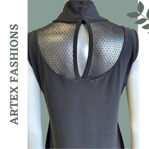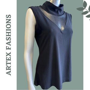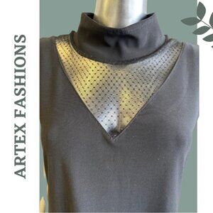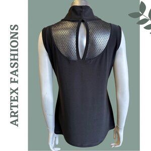 Black Sleeveless Knit Top Mock Neck Sheer Dot Neck Inlay Size Medium