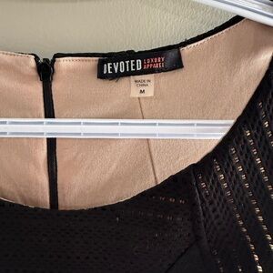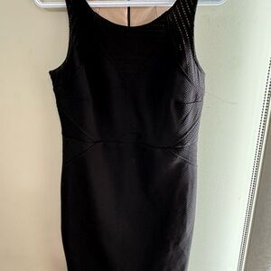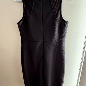 This sleek black mini dress features a scoop neckline and a form-fitting sheath style, perfect for a cocktail night out. Its sleeveless design and smooth fabric offer a timeless and versatile look.
