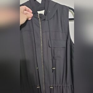 Stylish black sleeveless vest with a hood. Features drawstring details and front pockets.