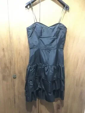 Chic black mini dress with delicate spaghetti straps and a sweetheart bodice. Tiered ruffle skirt adds playful movement. Smooth satin-like finish creates a polished look for evening events.