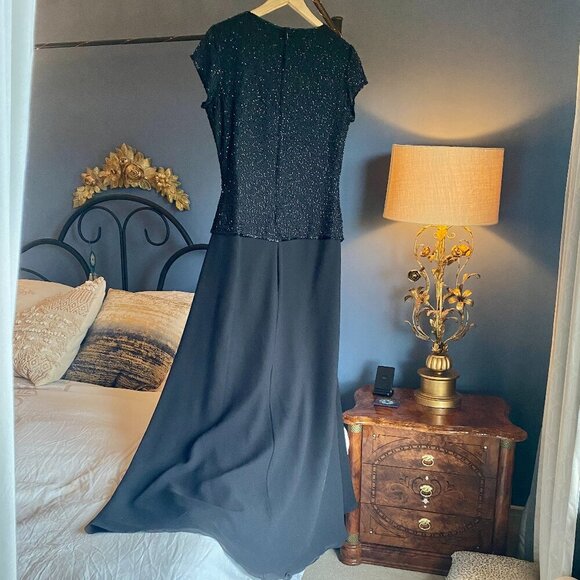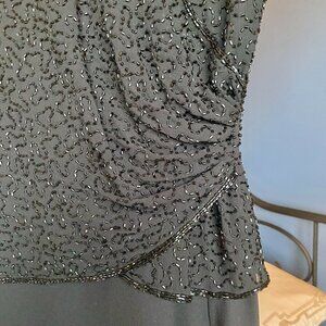 Black with beaded bodice and v-neck with wrap illusion gown from Jesse Ryan by Lori Michaels, size 10. Zips up back. Great used condition. Bust measures 19 inches laying flat, waist 15 inches laying flat, length from shoulder to hem is 56 inches. Cat friendly, nonsmoking home.