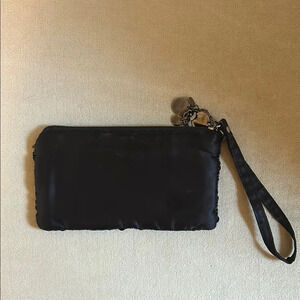 This chic black wristlet boasts shimmering sequins on one side, perfect for making a statement. Its compact design and handy wrist strap provide both elegance and practicality, ensuring your essentials are stylishly secured.