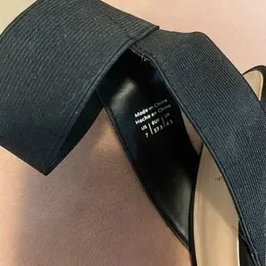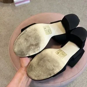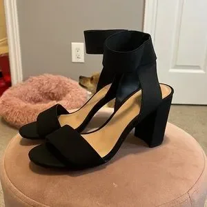 Have been worn maybe twice but they are still in very good condition. The shoes are extremely comfortable!!! There is a mark on the back of the left heel as pictured. The bands around the ankle are stretchy like an elastic.