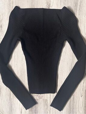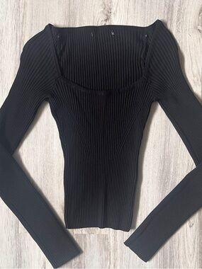 Women's black ribbed sweater with a flattering square neckline. Soft, stretchy knit for comfortable all-day wear. Long sleeves and a fitted silhouette.
