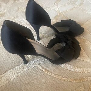Black peep-toe heels with bows from Stuart Weitzman. Very good used condition, scuffing on balls of soles. Size 6. Smoke-free home.