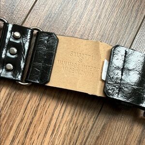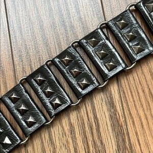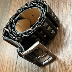 Stylish black vegan leather belt with studded details, perfect for adding an edgy touch to any outfit. Used once or twice, definitely vintage and will need to be conditioned to prevent cracking of the material. Total length: 38” including buckle
