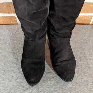 Good used condition. Flat black suede boots reach to the middle of the kneecap. Some wear spots on the suede as shown. Made in Canada.