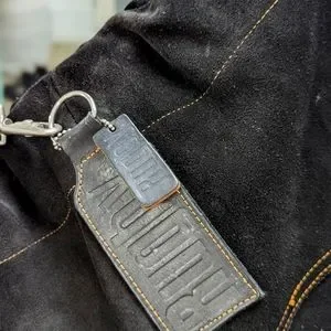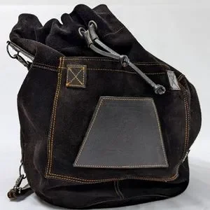Sleek black suede drawstring backpack with leather trim. Lightweight and versatile for daily use. Features external pockets and adjustable straps for comfort. Clean, minimalist design complements casual and smart-casual looks.
