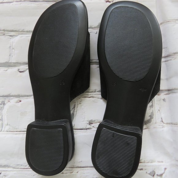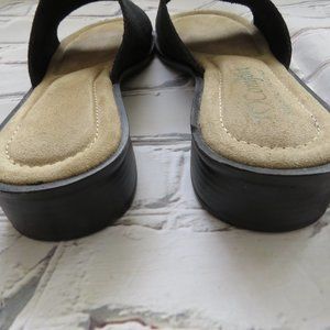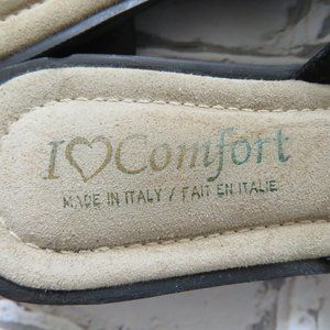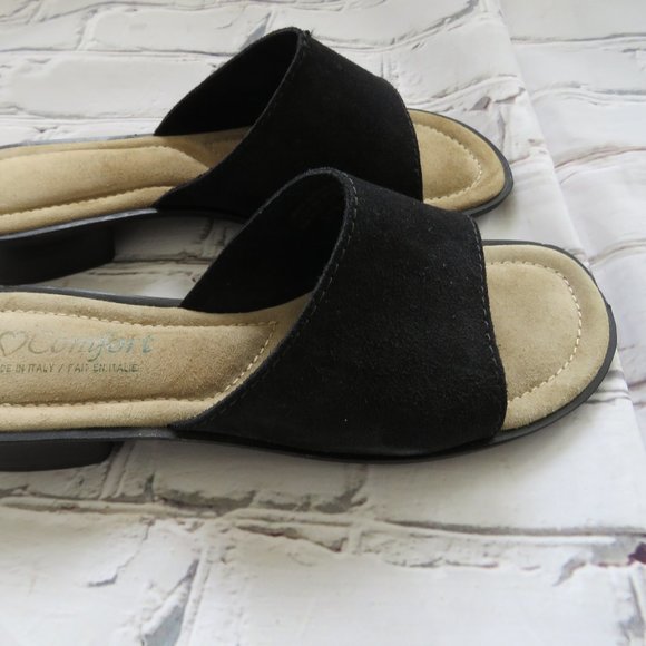 Black suede slip on sandals with a low 1 1/4" inch heel and padded insole. These sandals are Made In Italy and are from the I Love Comfort line. They are a women's size 39 and have only been worn a handful of times so in very good condition.