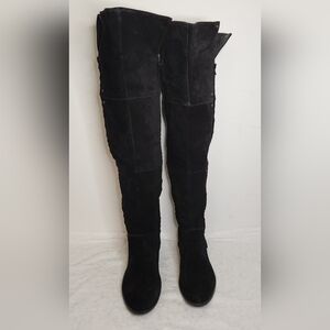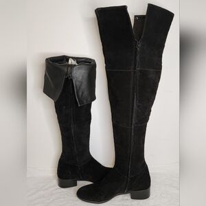 Tall Black Suede Leather Patchwork Over the Knee Boots with Gunmetal Studs and hidden Zippers up both Sides, by INGLEDEW'S.