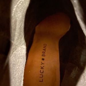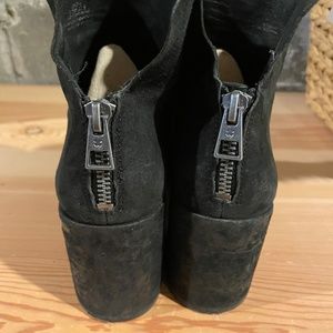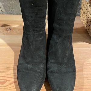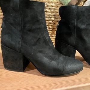 Lucky Brand black suede boots with 2 3/4 inch heel. Boots hit just above the ankle with a zipper up the back. They fit true to size. In very good used condition.
