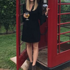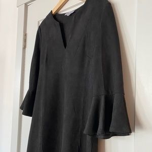 Soft and stretchy black suede shift dress. 3/4 bell sleeves with the prettiest frill detail. V neck but not too deep!