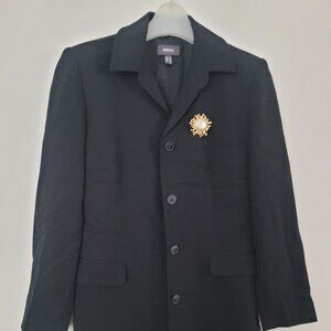 Black women's suit, office attire (including the pearly pin); 55% viscose; 45% wool; jacket and skirt fully lined
