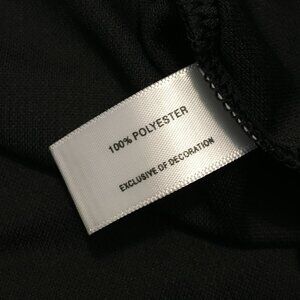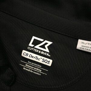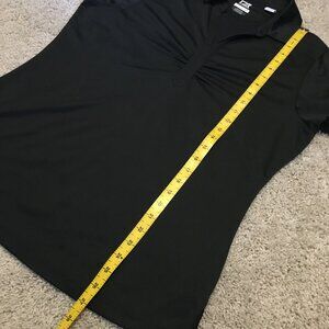 Very good preowned condition black, short-sleeve, almost polo-style, ruched bust, CB Drytec 50+ tee by Cutter & Buck. Up close it's actually a charcoal grey and black vertical pinstripe pattern to create black from far away. Everything in a stylish and comfortable package.