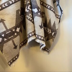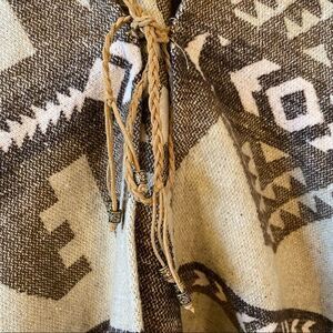 Cozy and stunning, the Black Swan Carlie Beige Print Faux Fur Poncho is a definite must for all your future expeditions! Woven wool-blend fabric has a bold southwest-inspired print in neutral shades of beige, brown, and cream. Detachable brown faux fur collar tops the draping open front with braided faux leather tie, and dramatic high-low hem.