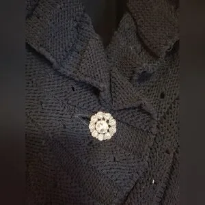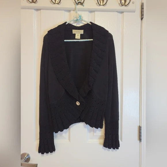 Black vintage sweater with ruffle edges and sleeves, with a gorgeous center piece button from Susan Bristol.